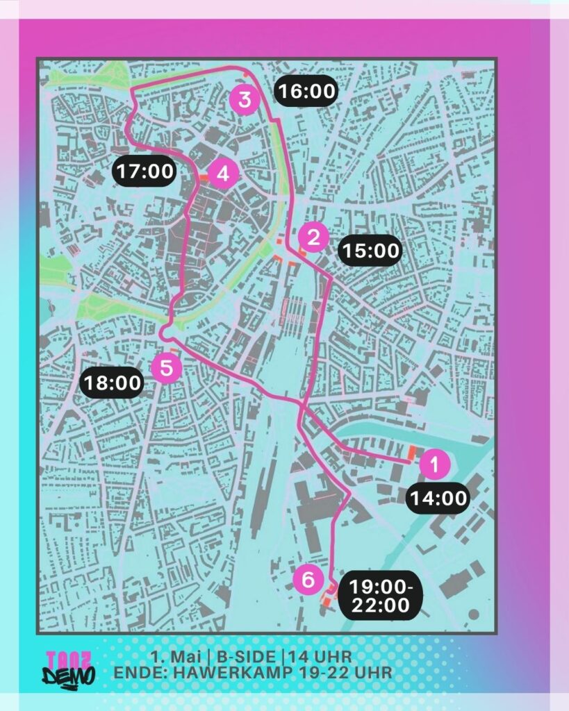 Münster. Elektronische Musik, Redebeiträge und gesellschaftliche Themen: Am Freitag, 1. Mai, zieht in Münster erneut eine Tanzdemo durch die Innenstadt. Die Veranstaltung startet um 14 Uhr an der B-Side und endet später am Hawerkamp. Organisiert wird sie zum zweiten Mal von den Kollektiven Kontroversium und 538.