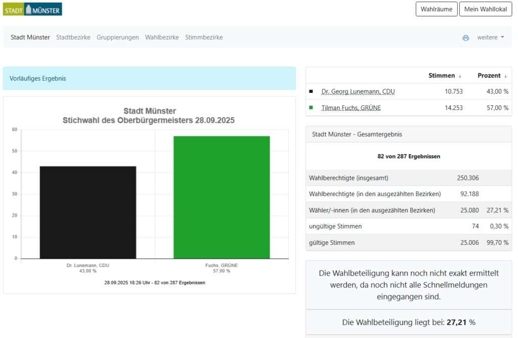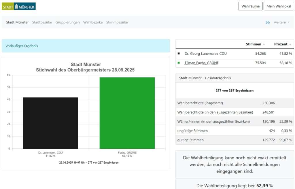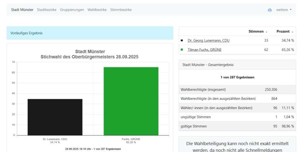 Mit 277 von 287 ausgezählten Stimmbezirken steht Tilman Fuchs (Grüne) bei 58,2 Prozent, während Georg Lunemann (CDU) 41,8 Prozent erreicht. Der Abstand ist damit so deutlich, dass sich das Ergebnis nicht mehr entscheidend verschieben dürfte. Nach 16 Jahren CDU-geführter Rathauspolitik deutet alles auf einen historischen Wechsel hin: Münster bekommt erstmals einen grünen Oberbürgermeister.