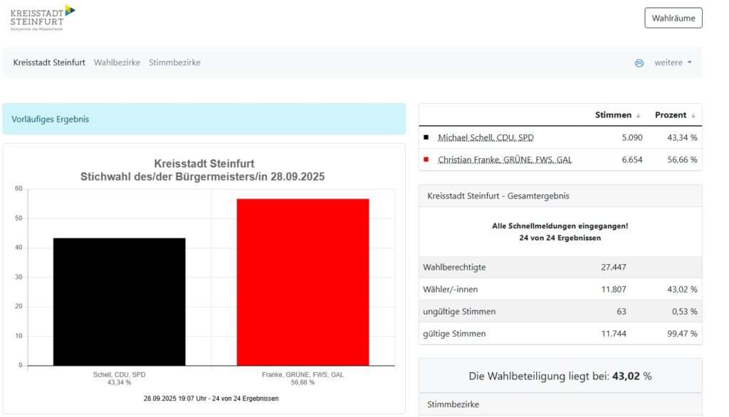In Steinfurt setzt sich Christian Franke (Grüne/FWS/GAL) mit 56,7 Prozent klar gegen Michael Schell (CDU/SPD) durch, der auf 43,3 Prozent kommt. Damit erlebt die CDU die nächste herbe Niederlage im Münsterland. Überraschend ist das Ergebnis auch deshalb, weil FDP-Bürgermeisterin Claudia Bögel-Hoyer nicht erneut angetreten war und die Christdemokraten mit einem gemeinsamen Kandidaten von CDU und SPD ins Rennen gegangen waren.