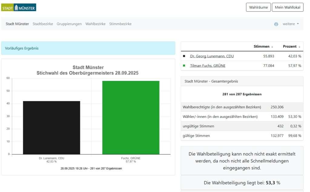 Mit 281 von 287 ausgezählten Stimmbezirken liegt Tilman Fuchs (Grüne) bei 58,0 Prozent, Georg Lunemann (CDU) kommt auf 42,0 Prozent. Der Vorsprung ist so groß, dass das Ergebnis praktisch feststeht: Münster wählt erstmals einen grünen Oberbürgermeister. Die Wahlbeteiligung liegt bisher bei 53,3 Prozent und damit fast identisch zum Wert von 2020 (53,9 Prozent).