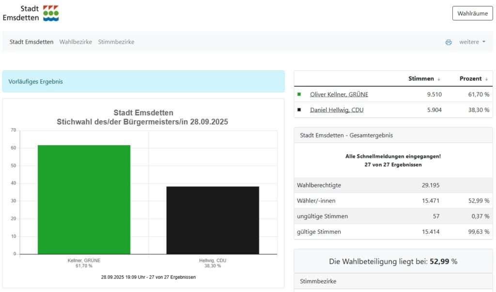 Oliver Kellner (Grüne) verteidigt sein Amt eindrucksvoll und gewinnt die Stichwahl mit 61,7 Prozent. Herausforderer Daniel Hellwig (CDU) erreicht 38,3 Prozent. Damit setzen die Grünen auch in Emsdetten ein starkes Zeichen.