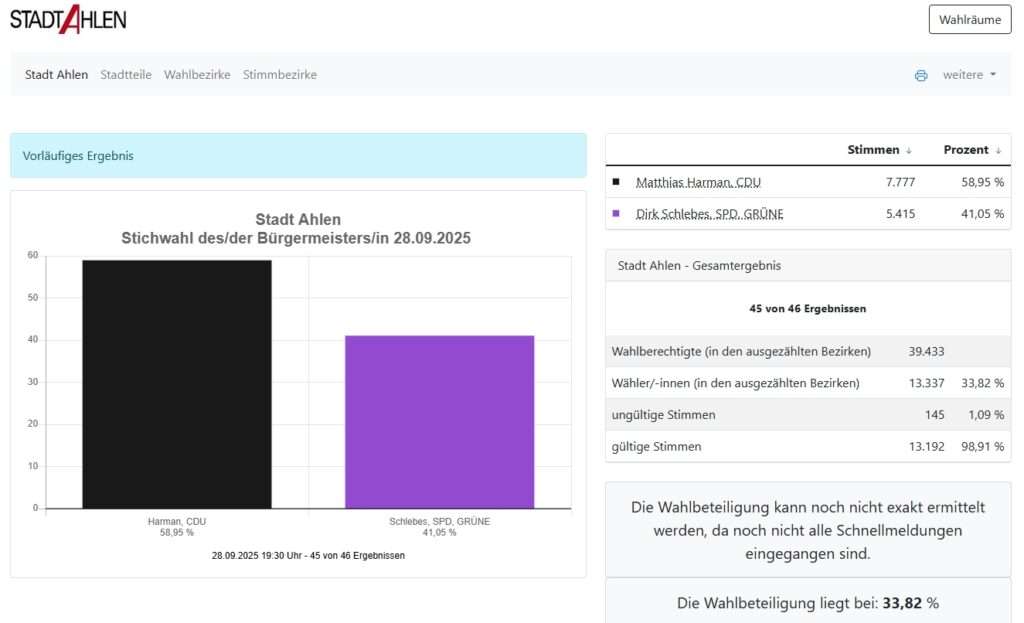 Während die Christdemokraten im Münsterland vielerorts Niederlagen hinnehmen müssen, gibt es in Ahlen eine der wenigen Erfolgsmeldungen: Matthias Harman (CDU) setzt sich in der Stichwahl mit 58,9 Prozent klar gegen Dirk Schlebes (SPD/Grüne) durch, der 41,1 Prozent erreicht. Damit bleibt das Rathaus in Ahlen fest in CDU-Hand.