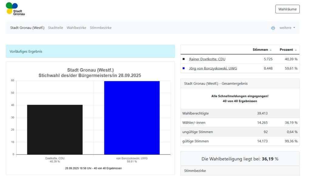In Gronau verliert CDU-Bürgermeister Rainer Doetkotte die Stichwahl deutlich. Mit 40,4 Prozent bleibt er klar hinter Herausforderer Jörg von Borczyskowski (UWG), der 59,6 Prozent erreicht. Damit wechselt das Rathaus überraschend die politische Führung – kein guter Abend für die CDU im Münsterland bisher.