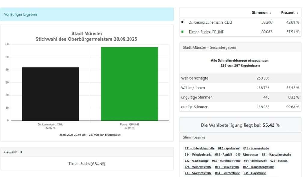 Alle 287 Stimmbezirke sind ausgezählt: Tilman Fuchs (Grüne) gewinnt die Stichwahl mit 57,9 Prozent klar gegen Georg Lunemann (CDU), der 42,1 Prozent erreicht. Damit endet eine Ära – seit 1999 stellte die CDU in Münster den Oberbürgermeister. Mit Fuchs übernimmt erstmals ein Grüner die Rathausspitze. Die Wahlbeteiligung lag bei 55,4 Prozent.