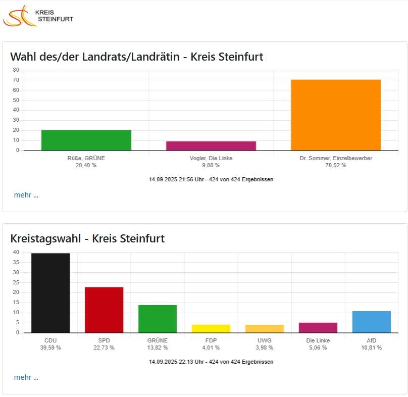 Im Kreis Steinfurt ist das Bild differenzierter. Bei der Kreistagswahl erreichte die CDU 39,6 Prozent. Damit bleibt sie stärkste Kraft, verliert aber leicht gegenüber 2020. Die SPD landet mit 22,7 Prozent auf Platz zwei, verliert ebenfalls im Vergleich zu den 25,3 Prozent vor fünf Jahren. Die Grünen fallen zurück: Statt 16,9 Prozent stehen nur noch 13,8 Prozent.