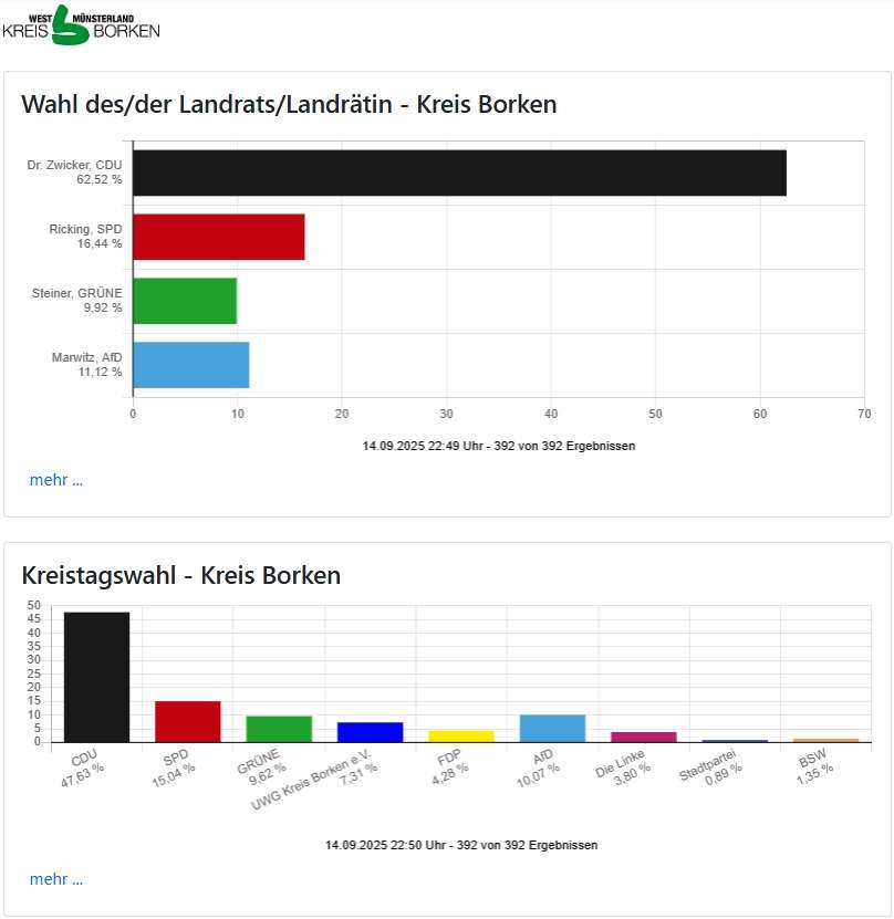 Bei der Landratswahl setzte sich Dr. Christian Schulze Pellengahr (CDU) souverän durch. Der seit 2015 amtierende Landrat verteidigte sein Amt mit 67,8 Prozent der Stimmen. Sein SPD-Herausforderer Vogt kam lediglich auf 32,2 Prozent. Damit schneidet Schulze Pellengahr sogar leicht besser ab als 2020, als er 66,7 Prozent erzielte. Die Wahlbeteiligung lag im Kreis Coesfeld bei 58,7 Prozent und damit deutlich über dem Wert von 2020.