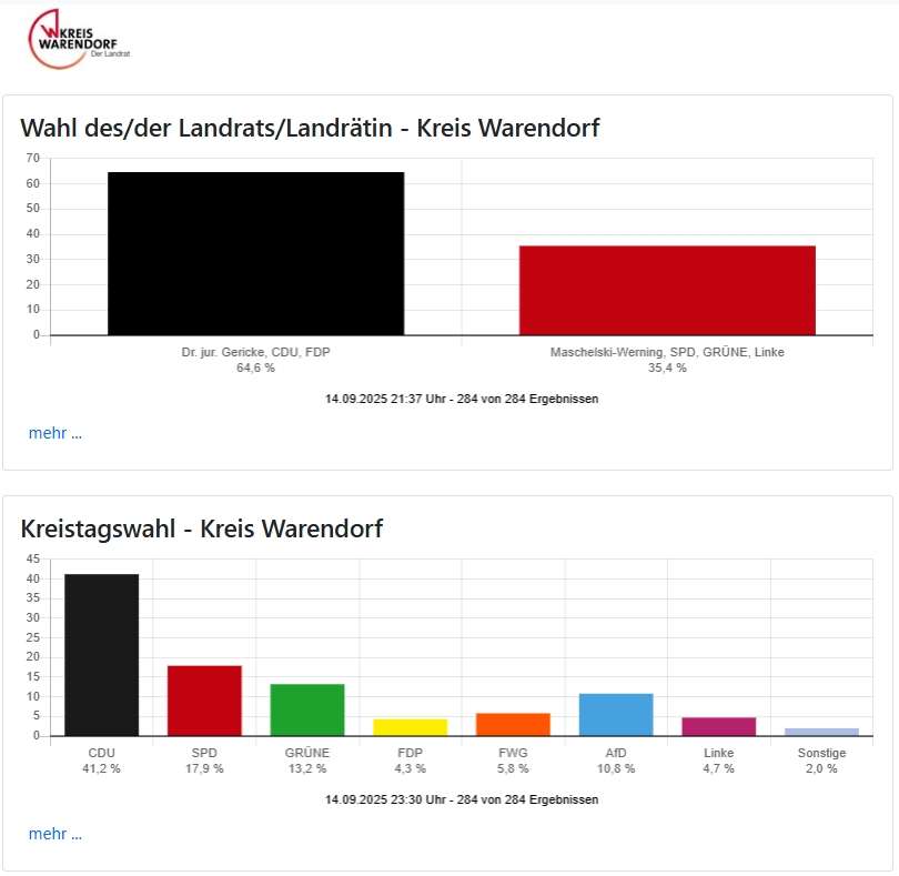 Bei der Landratswahl sicherte sich Dr. Olaf Gericke (CDU), seit 2006 im Amt, erneut einen klaren Sieg. Unterstützt von CDU und FDP kam er auf 64,6 Prozent. Herausforderin Maschelski-Werning, die von SPD, Grünen und Linken getragen wurde, erreichte nur 35,4 Prozent. Schon 2020 hatte Gericke mit 63,2 Prozent gewonnen – sein Ergebnis 2025 liegt nun noch etwas höher. Die Wahlbeteiligung lag bei 57,9 Prozent, ebenfalls höher als 2020.